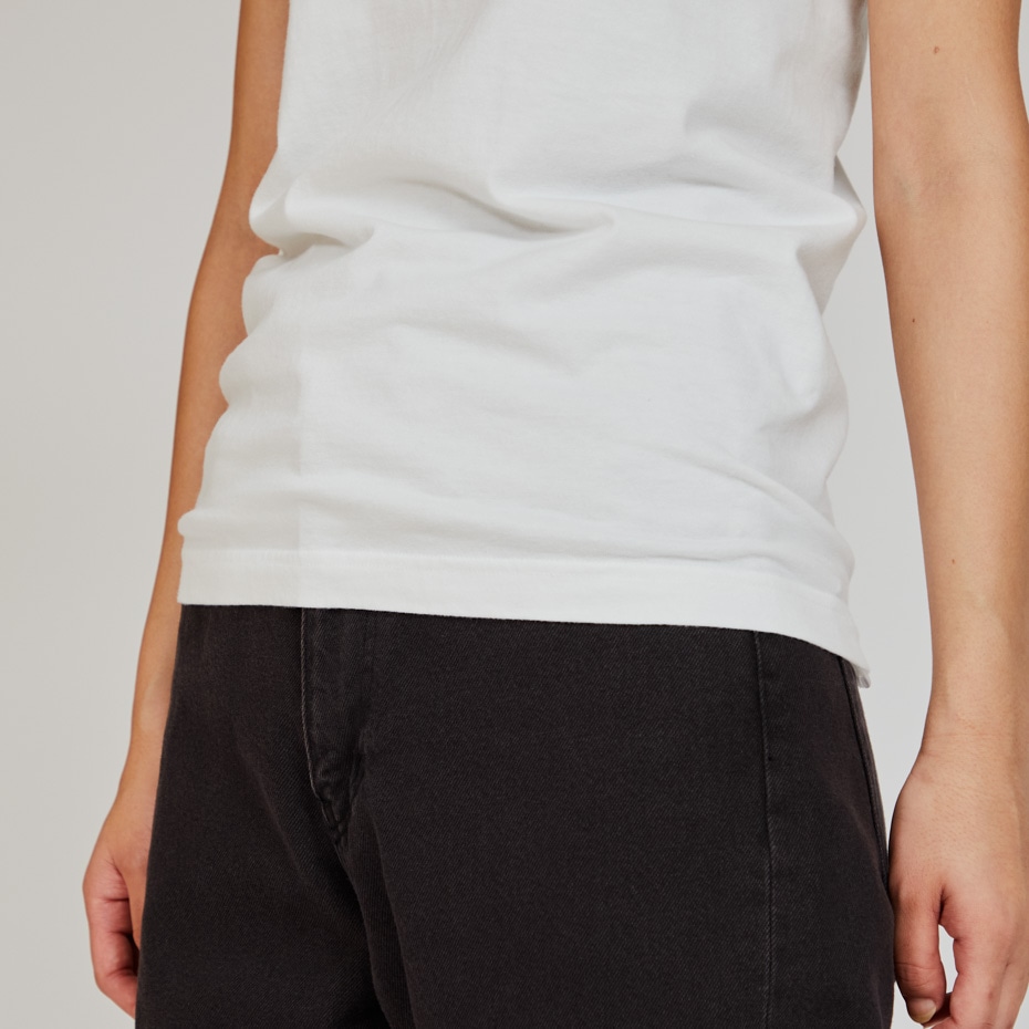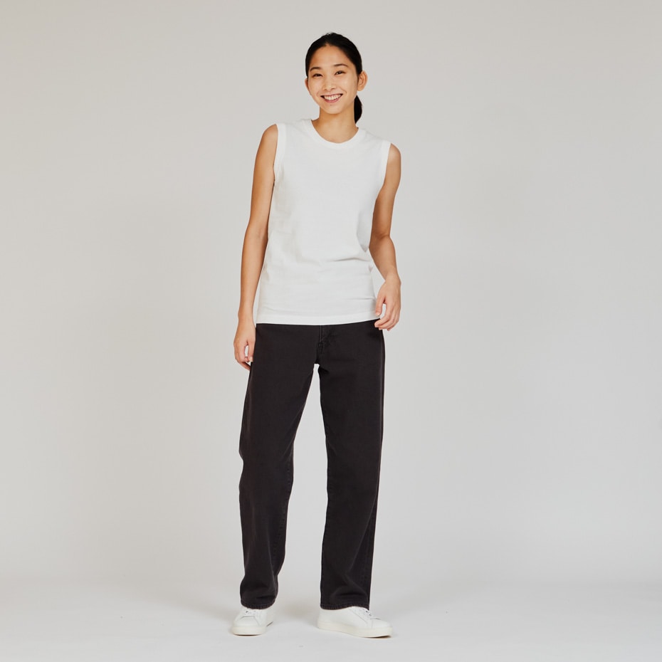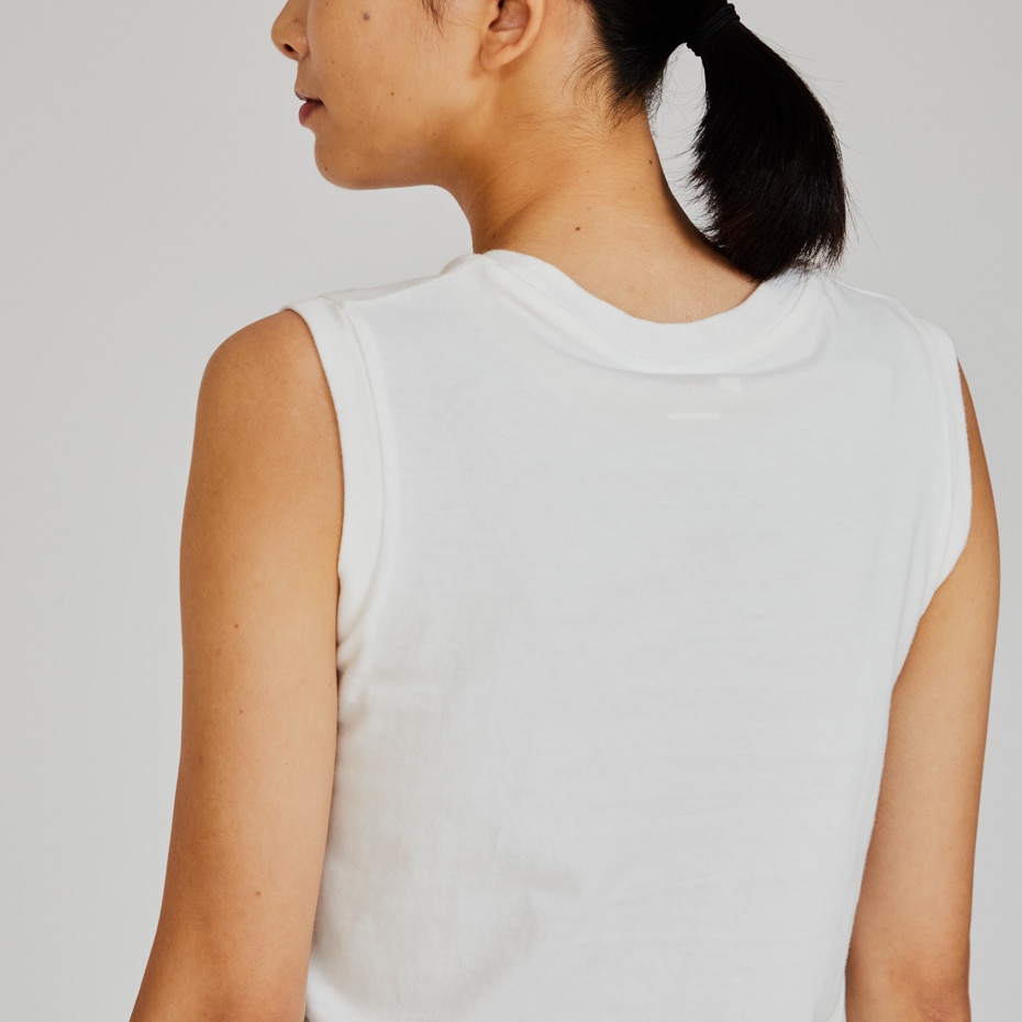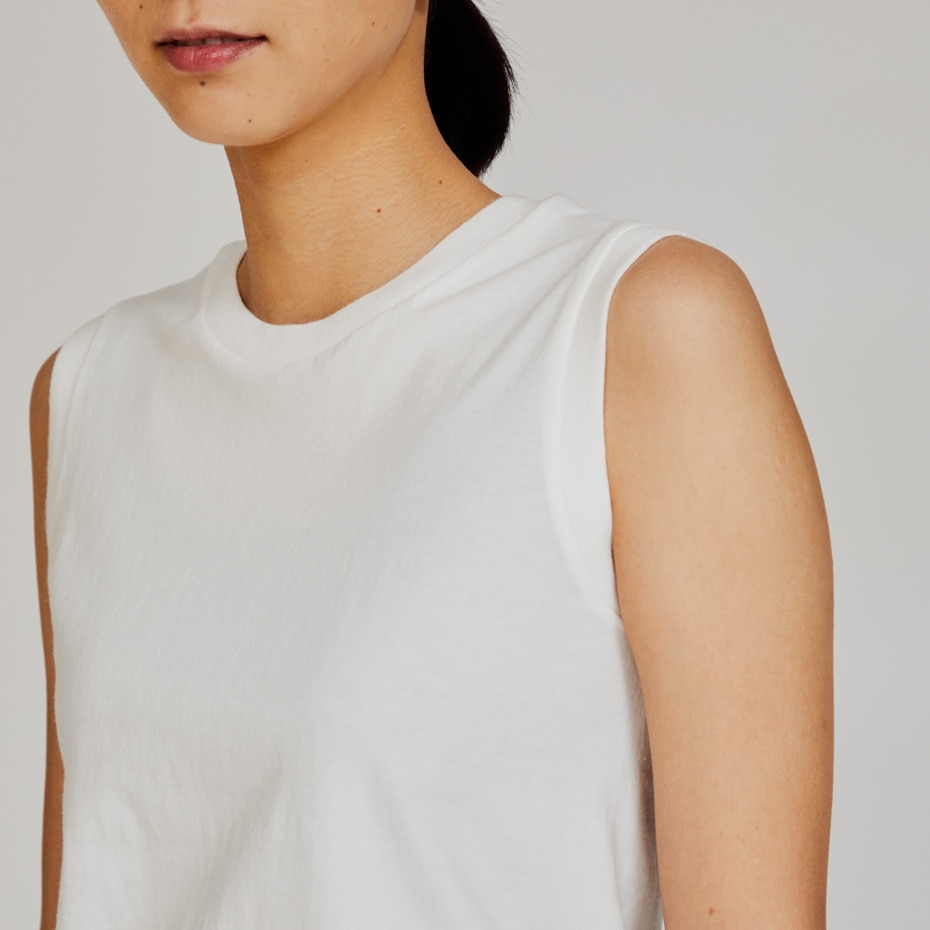 「日本人の心地良さのために」をコンセプトにしたHanes®(ヘインズ)を象徴する、コットン100%の「2P Pack T-Shirt(2枚入りパックTシャツ)」、Japan Fit for HER(ジャパン フィット フォー ハー) スリーブレスTシャツです。時代のニーズにマッチした厚さと素材感が特長の「透けにくい5.3オンス」を使用。ストレスを軽減する脇に縫い目のない丸胴編みで、着用の当初から着慣れた風合いが味わえるガーメントウォッシュ加工をしています。緩やかなネックラインなど日本人女性の体型に合わせたシルエットで絶妙なフィット感を実現しました。インナーとしても、一枚着としても着用できます。