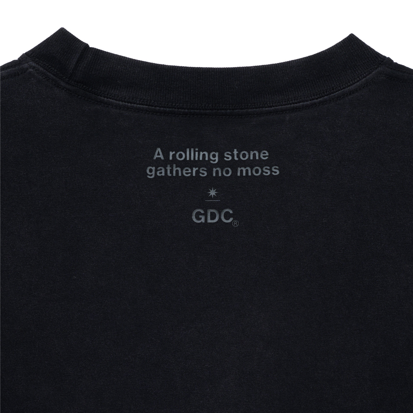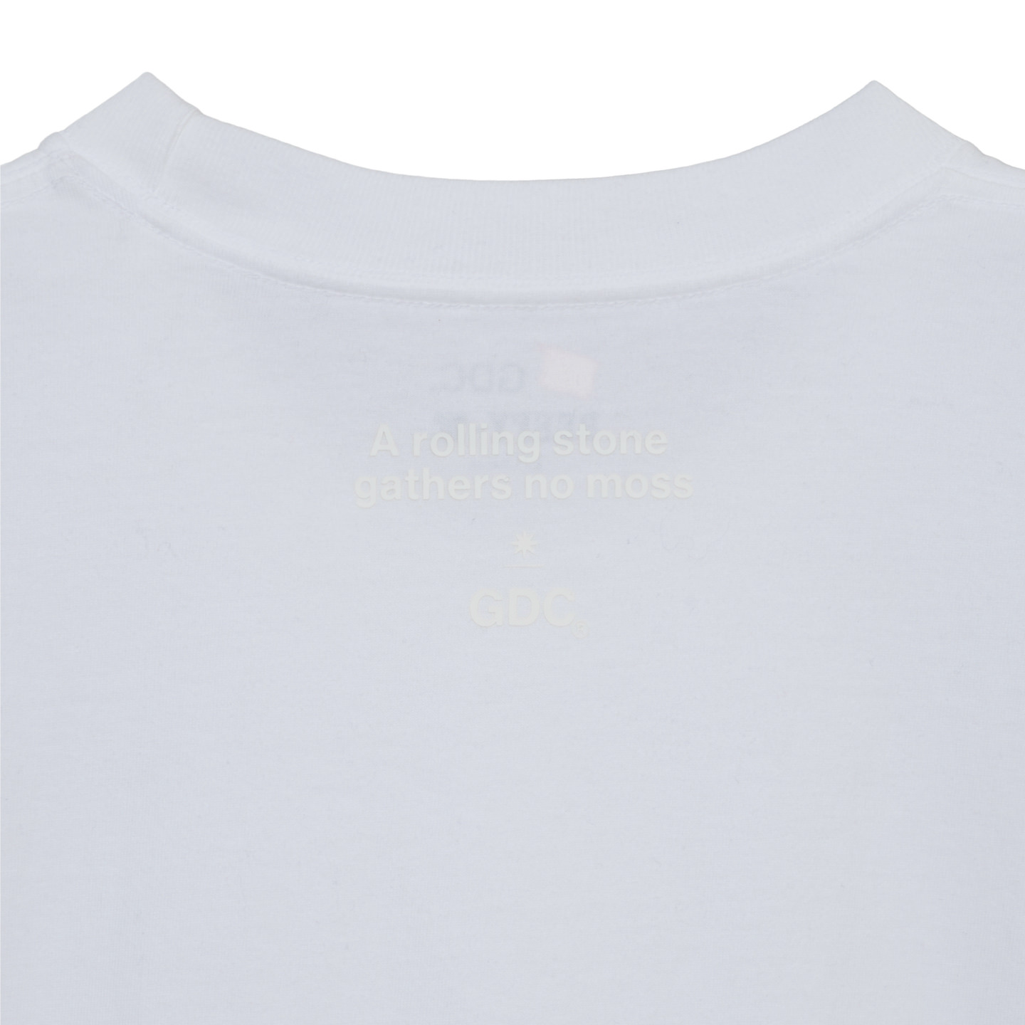 フロント胸元にはGDCロゴを配し、背面ネックポイントにはブランドの思想を象徴する“A rolling stone gathers no moss”のレターグラフィックをプリント。ミニマルな中にメッセージを込めたデザインとしています。