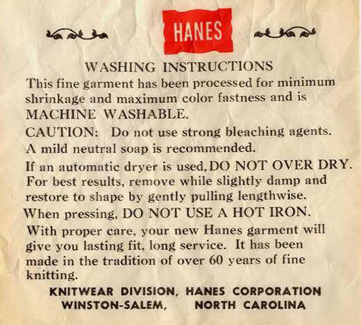 縮みや色落ちを最小限に抑えた良質の素材だが、洗濯やアイロンの使用等での注意を促した説明書。文末を見ると、この添付書が60年代後半に作成されたものだと分かります。