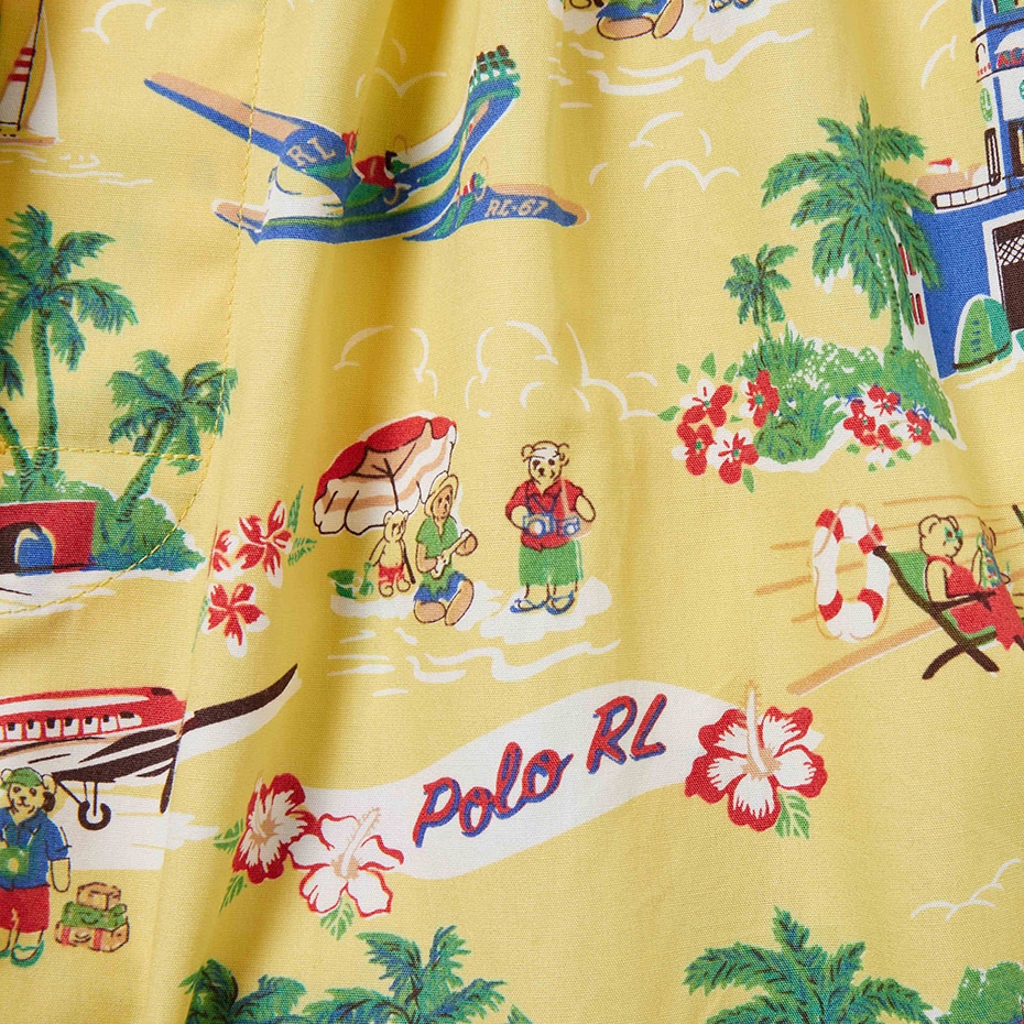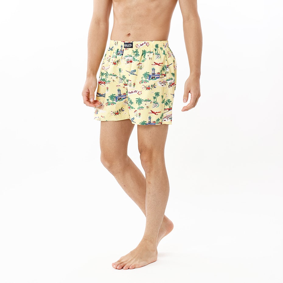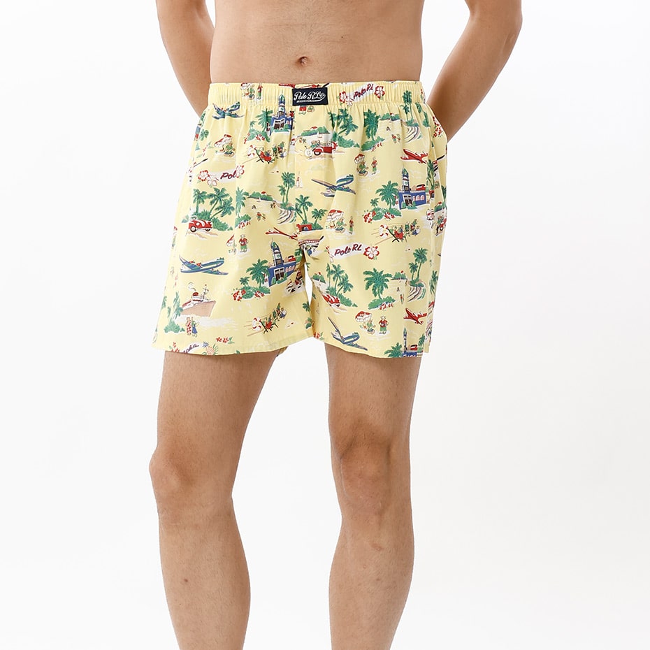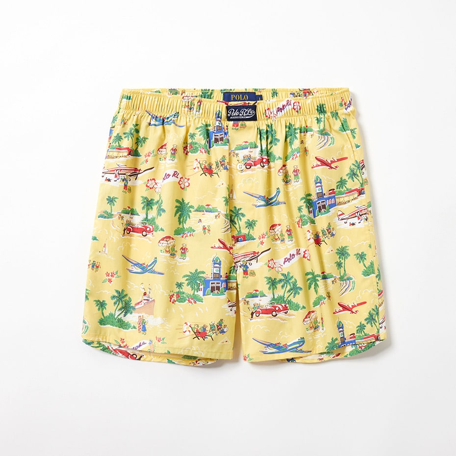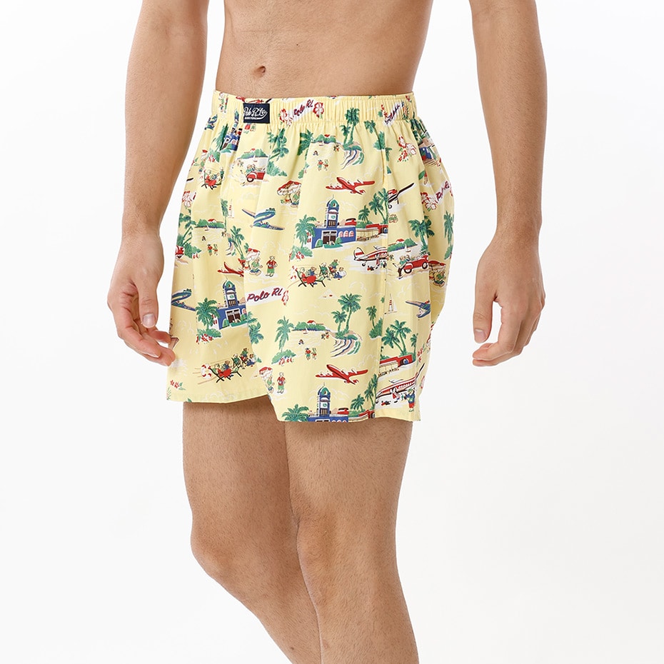 オーガニックコットン100%の平織生地を使用したトランクスです。表面のなめらかさと光沢のある素材感が特長。フロントセンターに縫い付けたラベルがポイントで、ロゴ刻印入りボタンがさり気ないこだわりです。イエローベースに休暇を楽しむ様々なPOLOベアをオールオーバープリントした、ギフトにも最適なアイテムです。前開き仕様。*3Lの大きなサイズ(RM4-B204K)も展開しています。