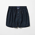 オーガニックコットン100%のトランクスです。平織生地で、表面のなめらかさと光沢のある素材感が特長。フロントセンターに縫い付けたラベルがポイントで、ブランドロゴを刻印したボタンもさり気ないこだわりです。ネイビーベースに小紋柄をプリントし、左裾にブランドアイコンのポロプレイヤー刺繍を入れた、ギフトにも最適なアイテムです。前開き仕様。*3Lの大きなサイズの商品です。