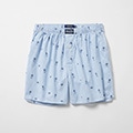 オーガニックコットン100%のトランクスです。平織生地で、表面のなめらかさと光沢のある素材感が特長。フロントセンターに縫い付けたラベルがポイントで、ブランドロゴを刻印したボタンもさり気ないこだわりです。サックスストライプにフットボールモチーフをプリントした、ギフトにも最適なアイテムです。前開き仕様。