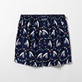 コットン100%の平織生地のトランクスです。なめらかで光沢のある素材感が特長で、カーボンピーチ加工により柔らかな風合いを加えています。ネイビーに白い帆とカラフルなフラッグをあしらった、爽やかなマリンテイストのプリント。ブランドロゴを刻印したボタンもさり気ないこだわりです。前開き仕様。
