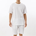 コットンと環境に配慮されたリサイクルポリエステルを混紡したニットシアサッカー素材を使用したショートスリーブクルーネックシャツです。無地でありながら織柄がストライプに見える表面感と、軽い着心地が特長。ストレッチ性が高く、生地表面に凹凸のある構造がもたらす清涼感も魅力です。左裾に全ボディカラー共通のネイビーで入れたブランドアイコンのポロプレイヤー刺繍もポイントです。同素材を使用したショートパンツ(RM8-B306)も展開しているので、セットアップでの着用もオススメです。