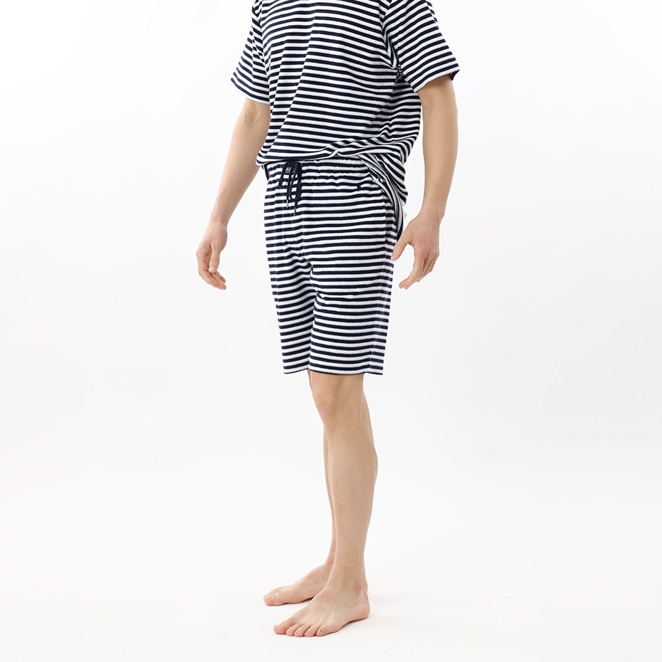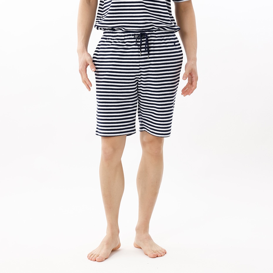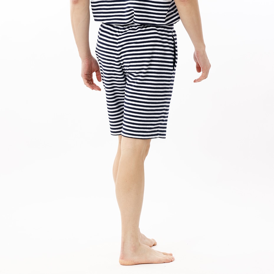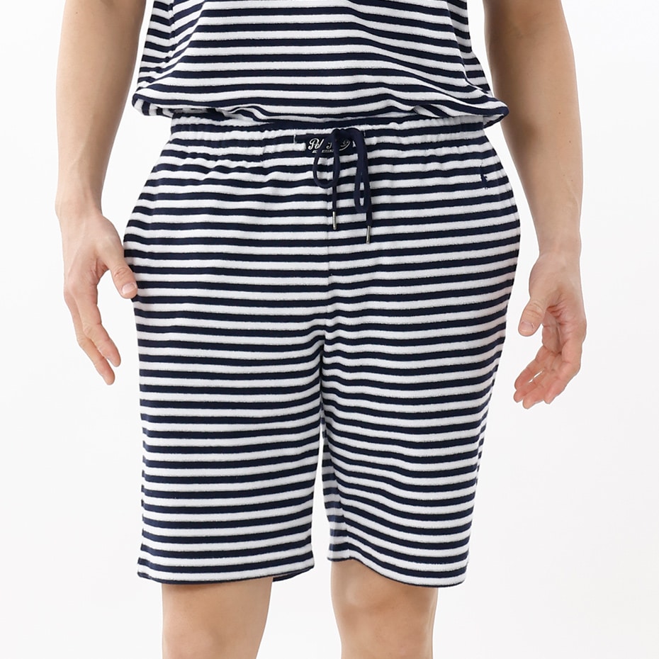コットンをベースに、環境に配慮されたリサイクルポリエステルを混紡したテリークロス(パイル)素材を使用したスリープショートパンツです。柔らかな風合いの心地良い肌当たりも魅力。乾きやすさと軽い着心地も特長です。フロントセンターに縫い付けたラベルと、左ウエスト部分に入れたブランドアイコンのポロプレイヤー刺繍もポイントです。同素材を使用したショートスリーブクルーネックシャツ(RM8-B204)、ショートスリーブジョニーカラー(スキッパー)シャツ(RM8-B205)も展開しているので、セットアップでの着用もオススメです。