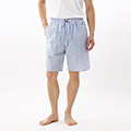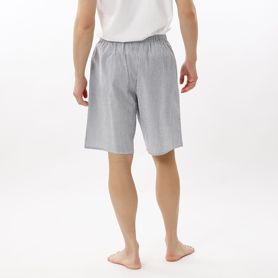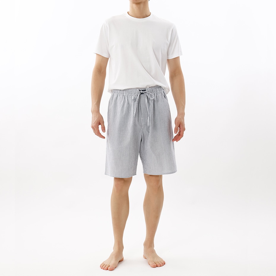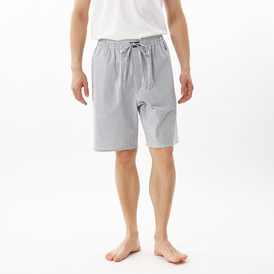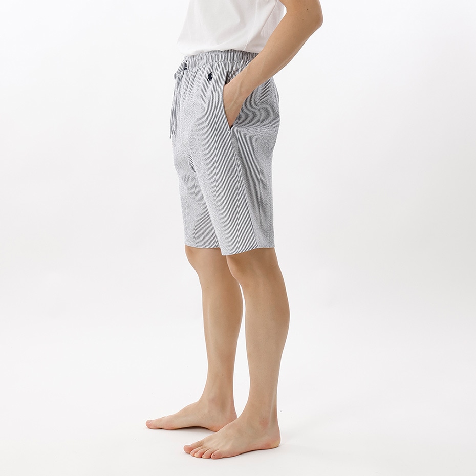オーガニックコットン100%のシアサッカー生地を使用したスリープショートパンツです。生地表面に凹凸のある構造がもたらす、清涼感のある着心地が特長。膝丈のリラックスフィットで、日常的な動きにもスムーズに対応します。爽やかなストライプ柄で、フロントセンターに縫い付けたラベルと、左ウエスト部分に入れたブランドアイコンのポロプレイヤー刺繍がポイントです。両サイドにポケット付き。